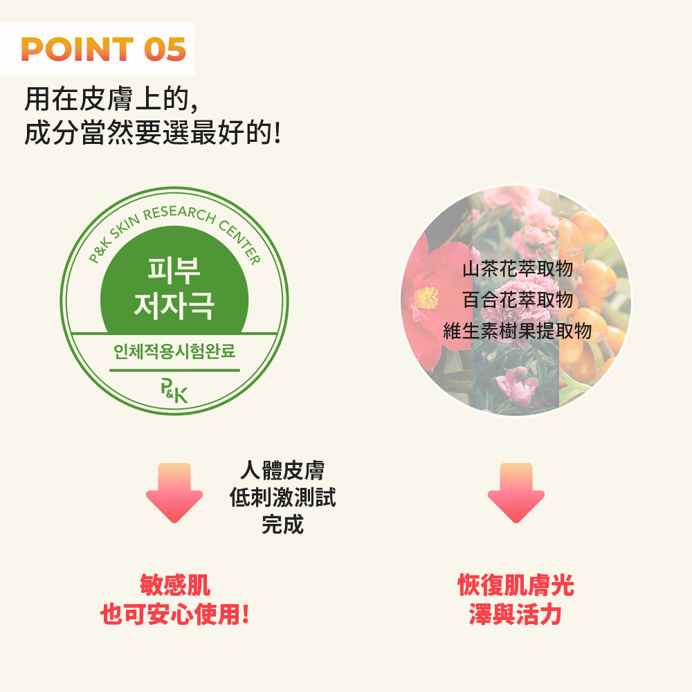 1. 使用化妝品時或使用後,若使用部位因陽光直射而出現紅斑、腫脹、瘙癢等異常症狀或副作用,請諮詢專業人士。