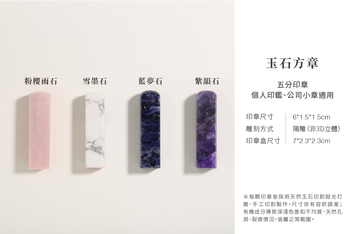 • 每顆印章製作採用天然玉石,依取用部位不同,會有色澤深淺及紋理落差,此為正常情形;照片顏色為大略參考,以收到實品為主